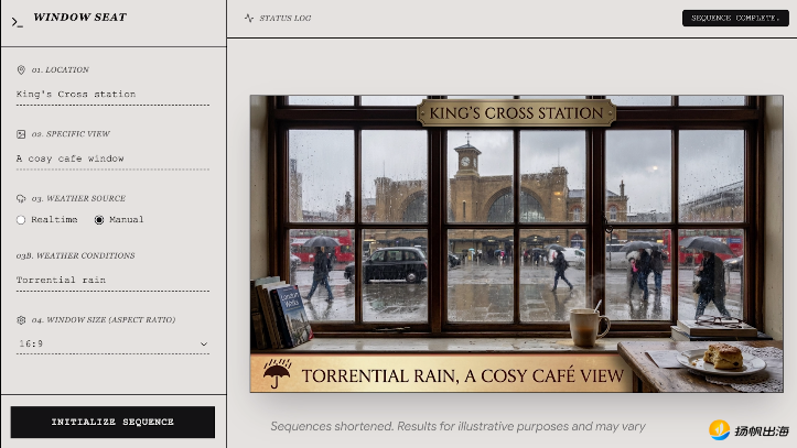 在谷歌的官方示例中,也对“窗边座位”场景进行了展示。NB 2能够结合知识储备与网络检索,根据全球各地的实时天气数据,生成更加逼真的窗外风景。