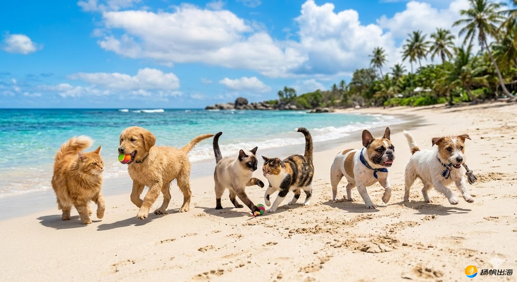 3只猫、3只狗一起在热带海边沙滩玩耍,蓝天白云,清澈海水,夏日氛围,每只宠物的品种有所差异,生动自然,高保真画质。