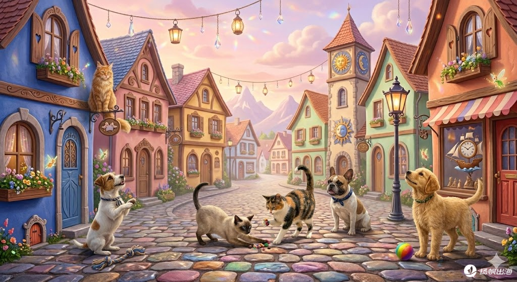 这些宠物一起漫步在彩色童话小镇,梦幻温馨,可爱风格,每只宠物外形与之前保持一致,位置和动作有所变化,细节丰富,光线柔和。