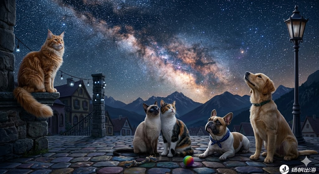 这些宠物们仰望星空,银河璀璨,氛围感拉满,每只宠物外观保持一致,动作和位置有所变化,史诗级画面,超写实。