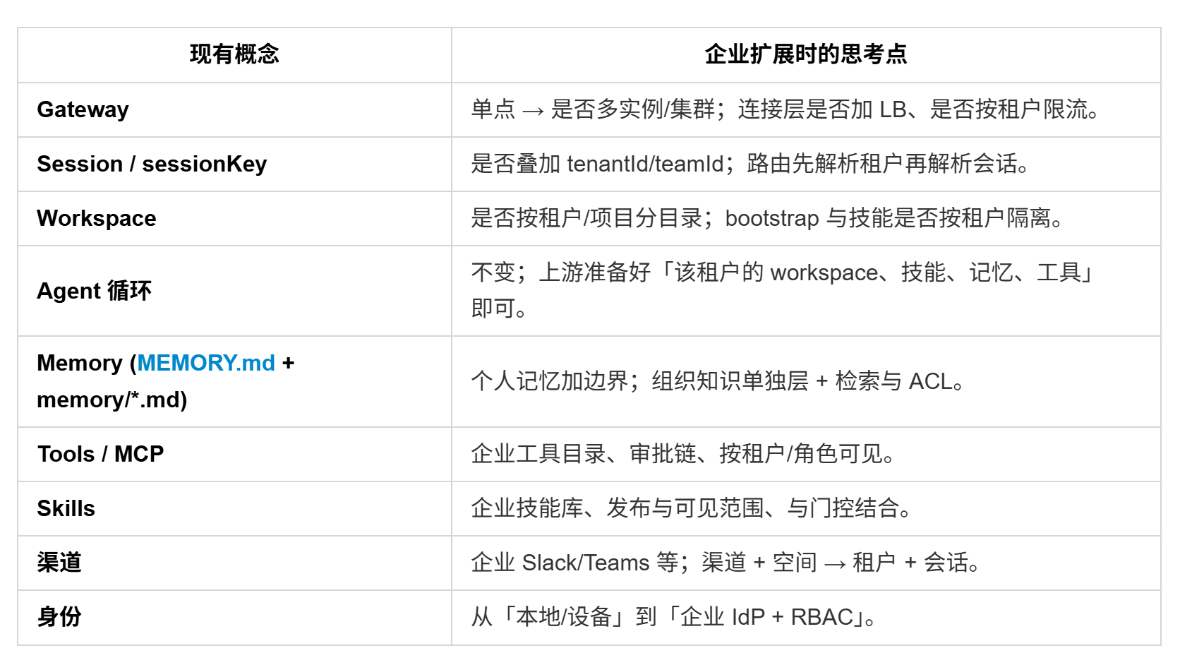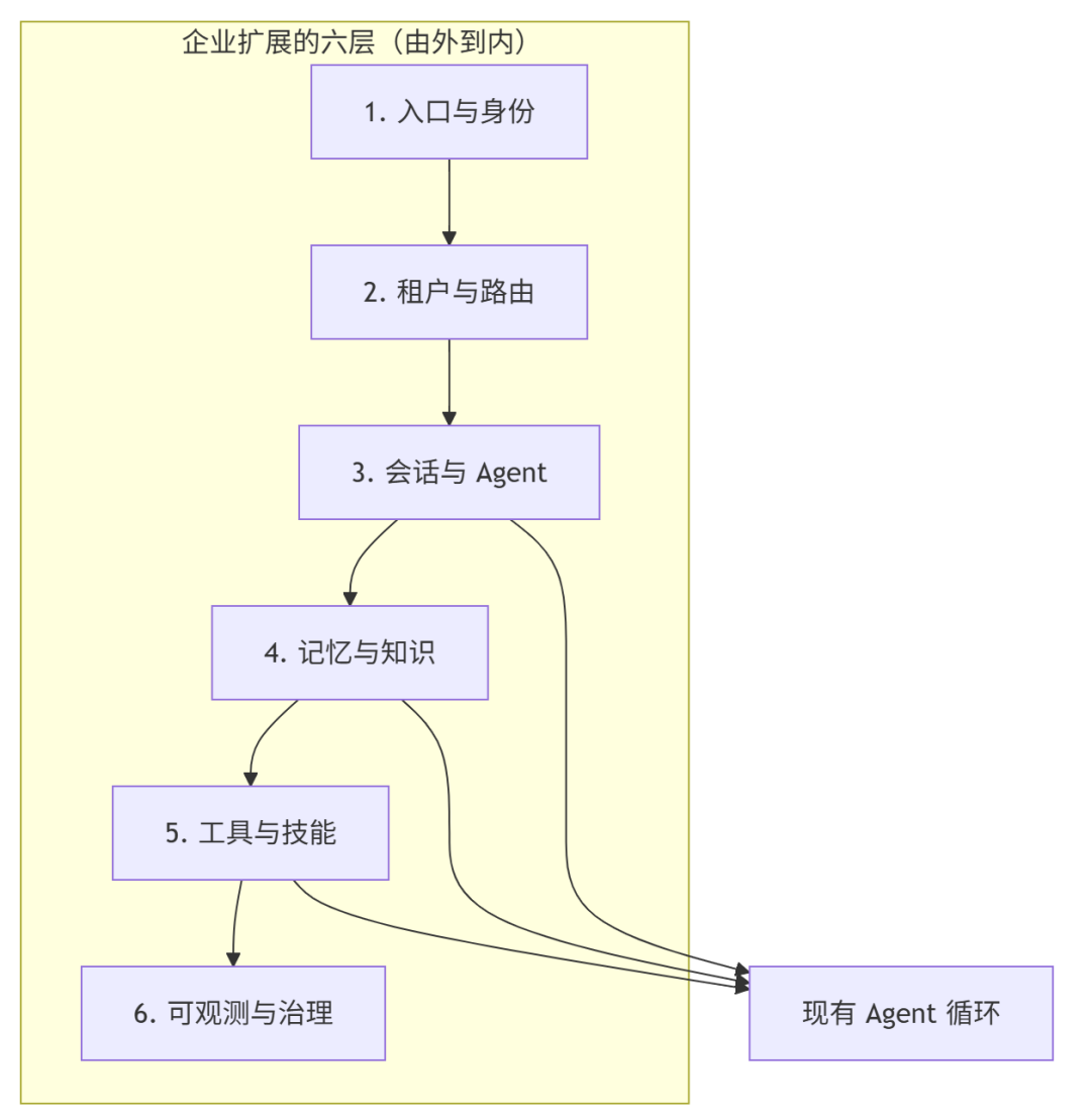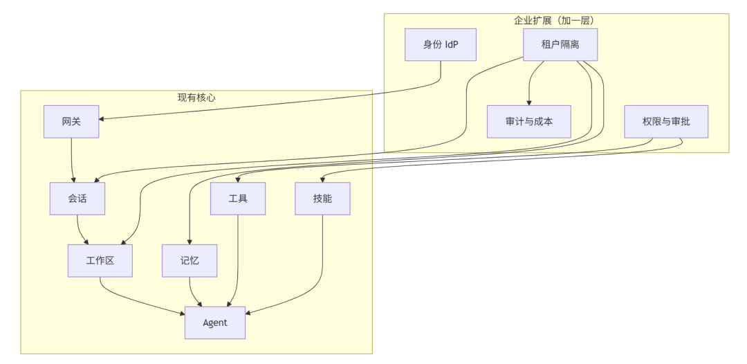 企业加层与现有组件的对应:身份 → 网关接入;租户 → 会话 / 工作区 / 记忆 / 审计;权限与审批 → 工具 / 技能。