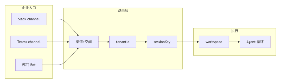 渠道与租户:例如「Slack 某 channel → 某团队 Agent」「Teams 某 channel → 某项目 Agent」,需要把「渠道 + 空间」映射到 tenant + sessionKey(或等价物)。