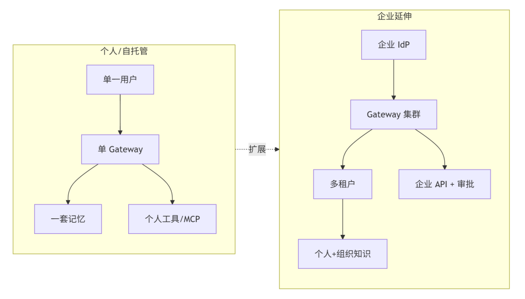 核心一句话:从「一个控制面、一个身份、一套记忆与工具」扩展到「多租户、多身份、分层记忆与受控工具」,需要系统地在每一层想清楚「边界在哪里、谁做决策」。