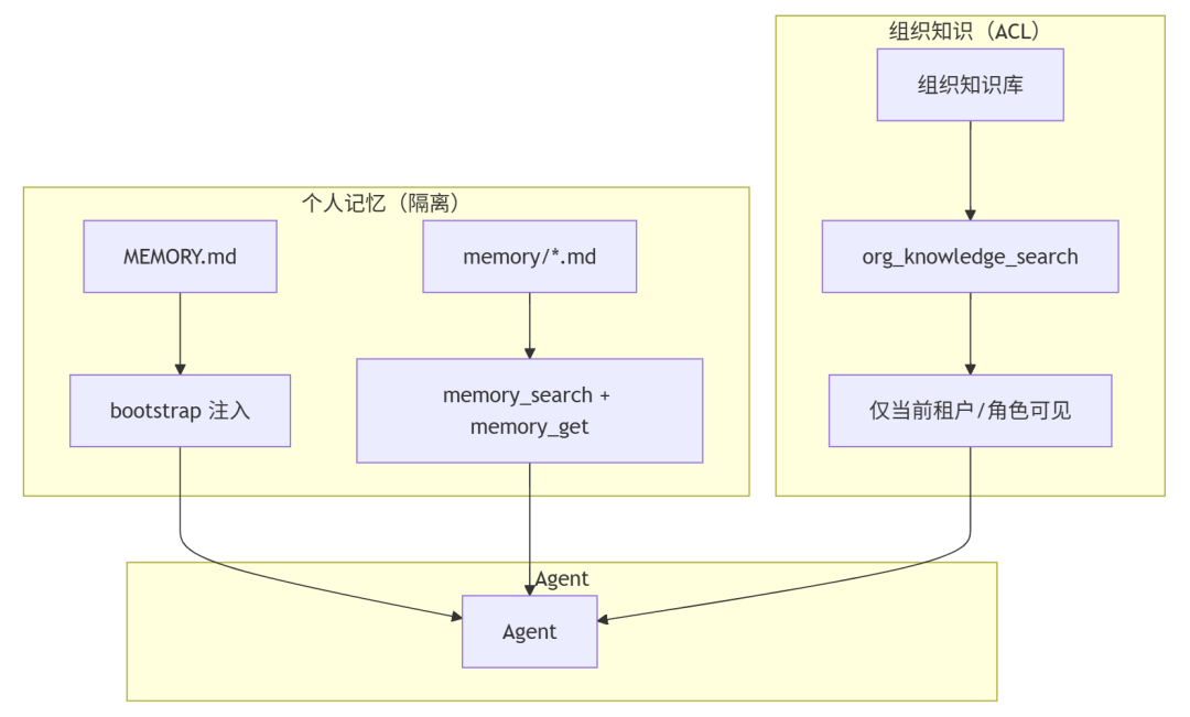 - 检索边界:memory_search 是否只查「当前用户/当前租户」的记忆?组织知识库是否单独索引、单独 API(如 org_knowledge_search)?