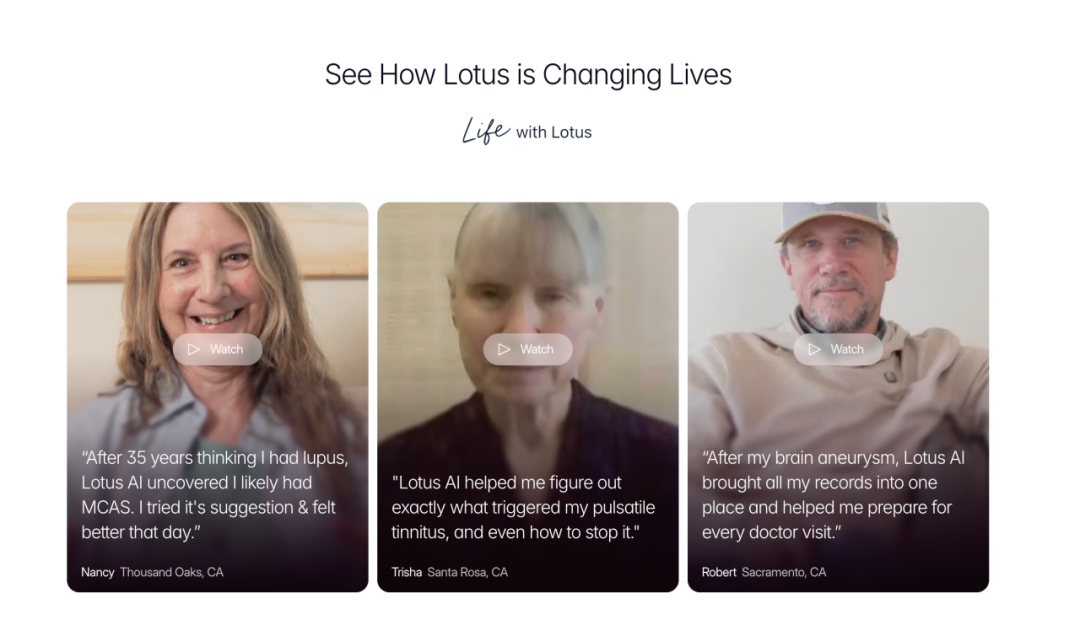 让我印象最深的是Lotus已经取得的一些实际成果。除了Nancy的案例,还有Robert,一位脑动脉瘤幸存者,经历了6次手术和超过30项实验室检测。Lotus AI为他提供了全天候支持,帮助他整理检查结果、管理护理流程,让他能更自信地与医生沟通。还有Trisha,多年来一直被搏动性耳鸣困扰却找不到答案,Lotus AI帮助识别了触发因素并在临床医生支持下指导干预,最终让她获得了缓解。这些不是营销话术,而是真实发生的医疗改善案例。