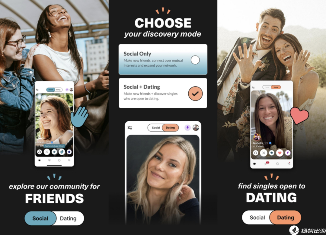 基于此,Upward给了用户两个基于使用目的的选项,一个是Social(社交),另一个则是Dating(约会)。选择仅Social,就代表想在应用中结交新朋友,基于共同兴趣建立联系,拓展个人社交圈;而选择Social+Dating则表示,用户不仅想要结识新朋友,还希望发现那些愿意约会的单身人士,希望有更进一步的发展。