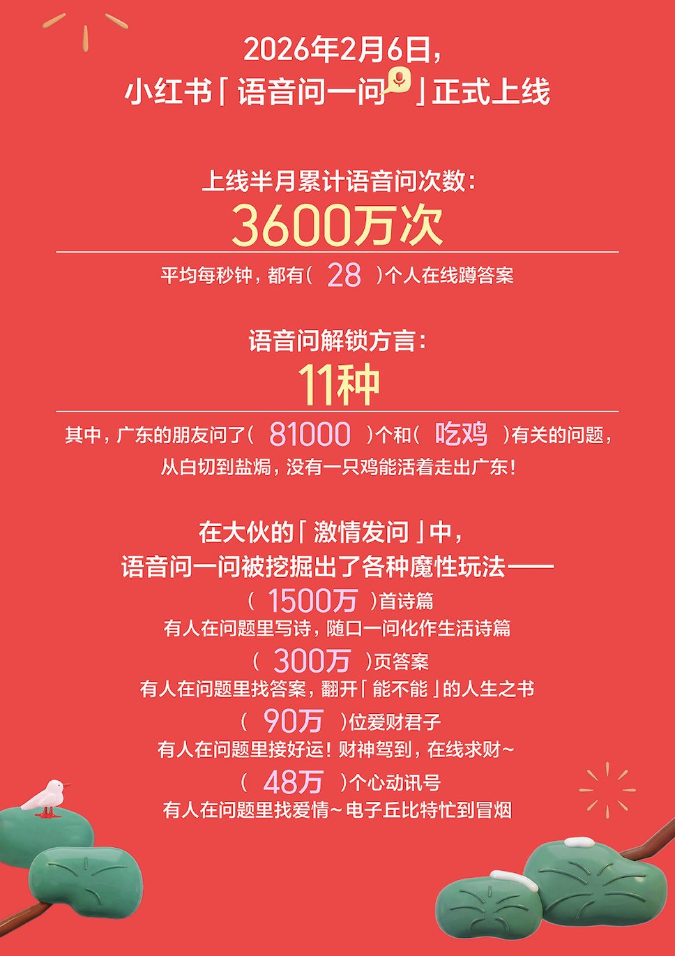 事实是,整个春节期间,语音问搜被小红书用户挖掘出各种魔性玩法:有人用语音写诗,有人在问题里接好运,还有人找爱情……上线半月,累计语音问次数就突破4800万次,平均每秒,有37人在线蹲答案。
