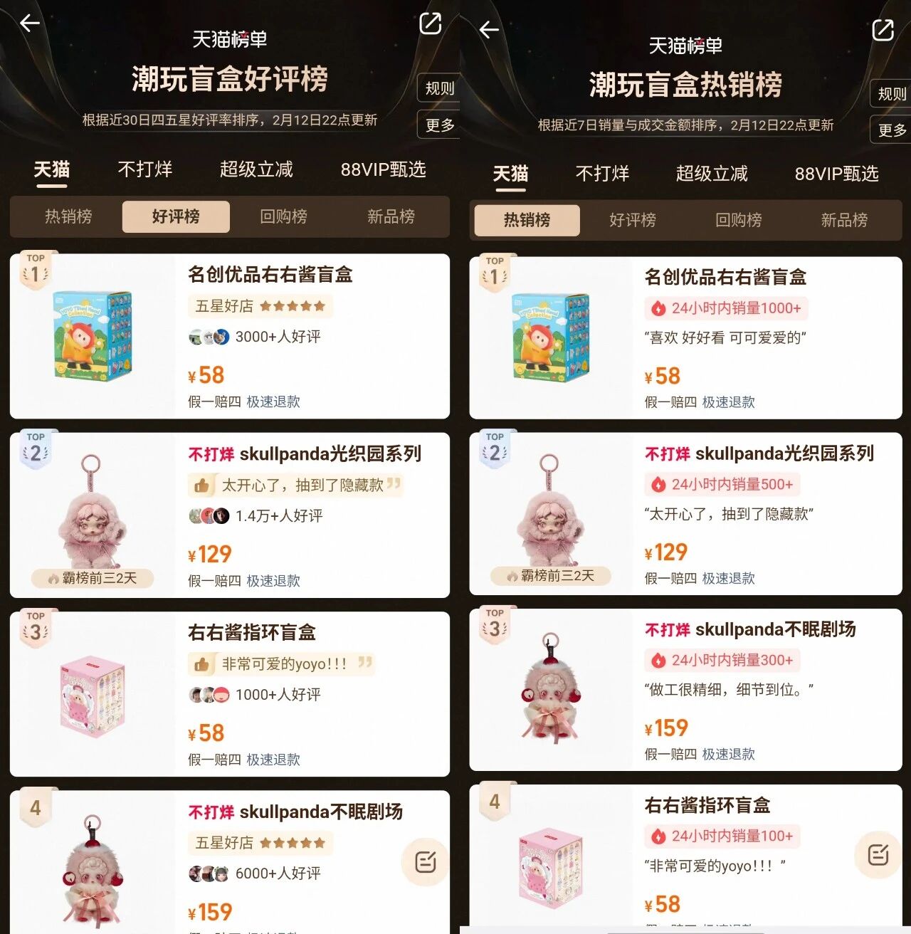 在2月中旬的天猫潮玩盲盒热销榜、好评榜中,YOYO的盲盒都位列第一,超过了泡泡玛特旗下的SKULLPANDA。