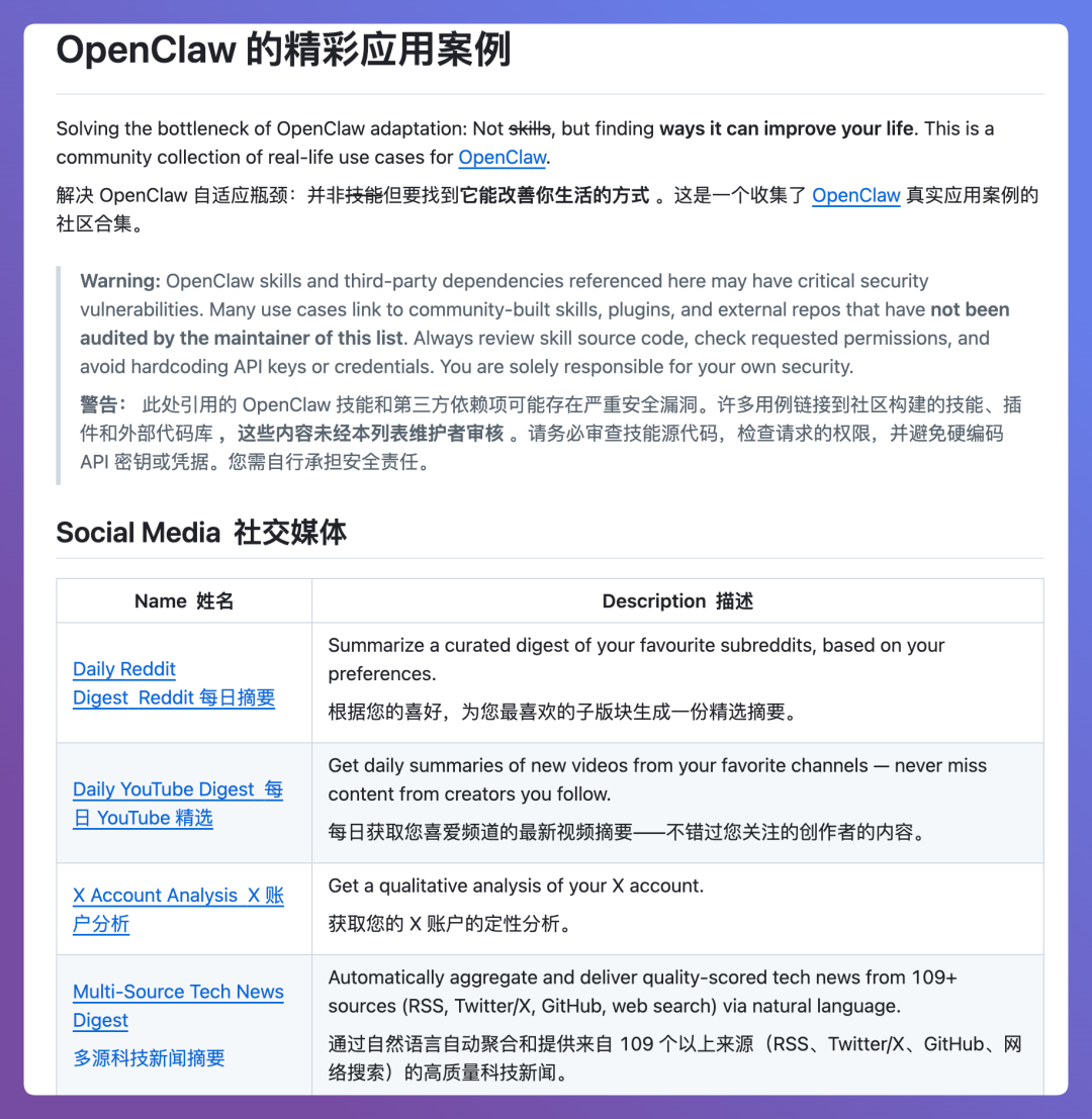 它搜出来的东西蛮有意思的,第一个usecase就让我眼前一亮,里面汇总了各种玩法清单,我可以直接去仓库里看清单的内容,然后有感兴趣的就让Codex直接给我安装上,让我的龙虾去跑。