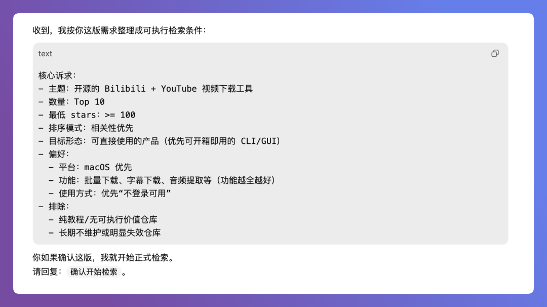 我只需要跟Agent讲我的需求是什么,它会自己去检索分析出和我需求最匹配的Github仓库。