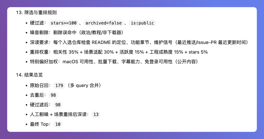 然后在过滤后的内容里去阅读项目的文档,最后根据相关性进行重排,产出最终的推荐项目。