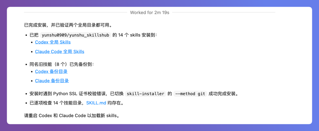 也可以直接告诉Codex或Claude Code:安装这个GitHub库的Skills到Codex和Claude Code的全局Skills文件里:https://github.com/yunshu0909/yunshu_skillshub
