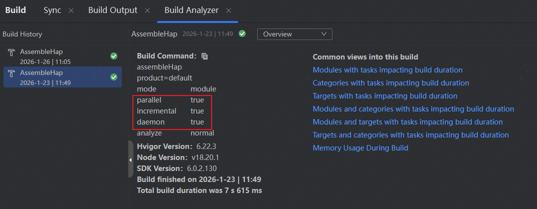 - 默认开启的编译优化配置:DevEco Studio提供了增量构建、并行构建等能力来提升构建效率,减少构建耗时。这些构建配置默认是开启的,开发者可以通过Build Analyzer工具,查看并行(parallel)、增量(incremental)、守护进程(daemon)的开启情况,建议配置为true,以提升构建效率。