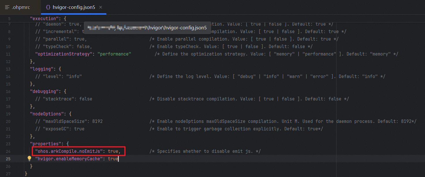 - 平衡编译性能和内存的配置:DevEco Studio提供了内存优先模式和性能优先模式,性能优先模式开启时,启用了任务缓存,编译结束后常驻内存增加。具体可通过hvigor-config.json5 -> properties -> hvigor.enableMemoryCache配置true。将 hvigor-config.json5 -> execution -> optimizationStrategy 设置为”performance”性能优先。开发者可基于实际开发环境灵活选择。