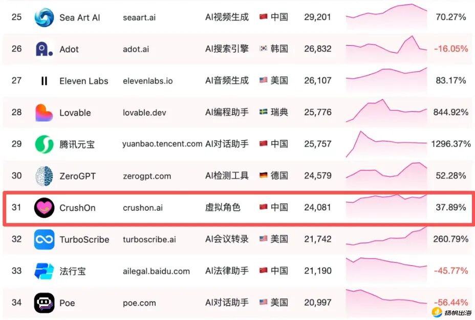 一个是字节跳动前员工推出的CrushOn,靠文字聊天和剧情演绎实现了月访问量超2000万,用户单次访问时长最高达16.2分钟的成绩,一度蝉联出海AI网站月活榜榜首长达4个月时间,同时也进入了2025年全球AI网站总榜(AIGCRank)第31名。