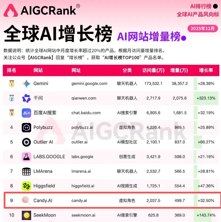 (2025年12月全球AI网站增量榜丨图源:AIGCRank)