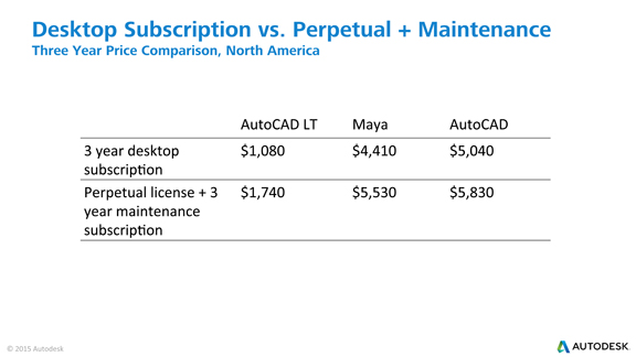 Autodesk 使用价格对比图表来说明订阅对客户来说是一种更好的选择
