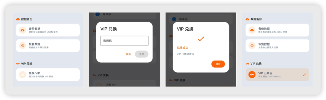 最终的实现效果如下图,通过常驻入口以及对用户数据条数的限制,触发 VIP 兑换。输入激活码后,通过 API 验证激活码是否可用。可用则兑换成功,并且在设置页面显示出 VIP 已激活的状态和有效期。