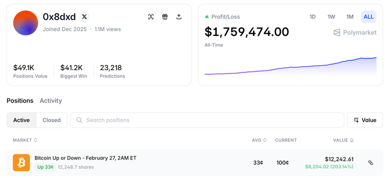 当人类交易员还在被恐惧与贪婪左右,一个名为“0x8dxd”的机器人账户,在Polymarket上悄悄完成了两万多次交易,盈利总和超过170万美元。