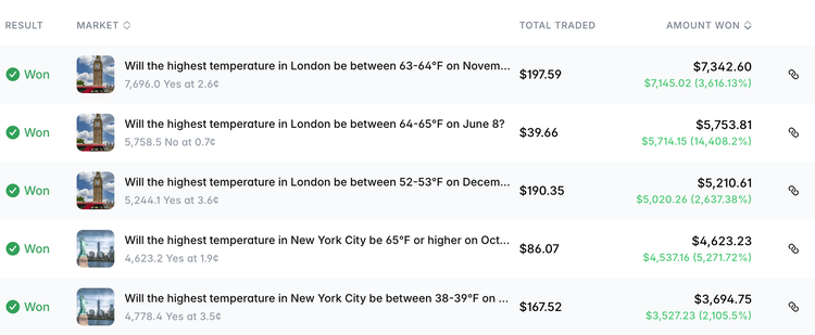 一个名为“automatedAItradingbot”的账户,2025年1月入驻Polymarket。它热衷于围绕天气预测下注,盈利超过7万美元。还有人发现,一个仅交易伦敦天气市场的机器人,在不到一年的时间里,把1000美元变成了2.4万美元。