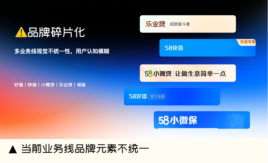 好借、快借、小微贷、乐业贷、保险……多业务线视觉各自为战,用户难以建立清晰的品牌认知,业务协同成本居高不下。