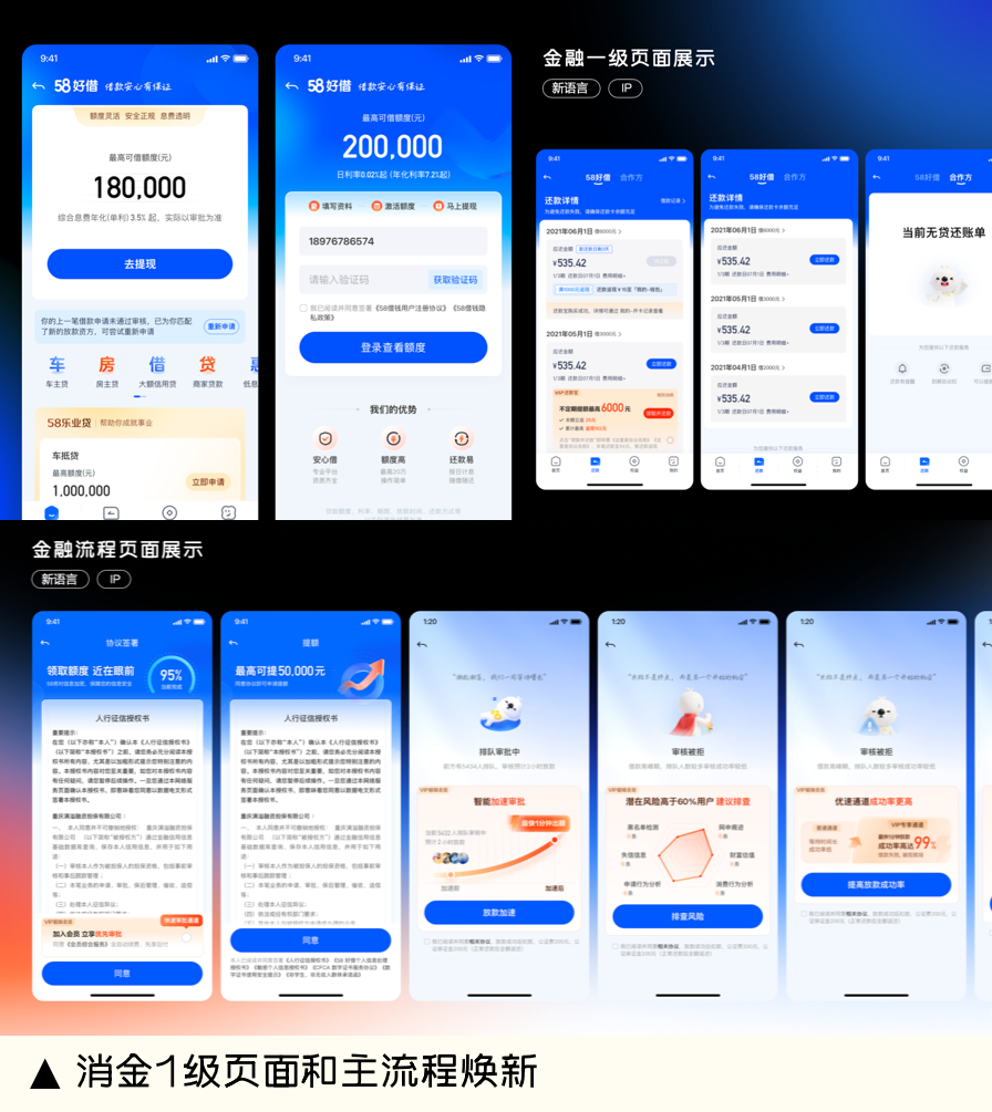 58消金产品一级页面全面焕新,额度展示、还款管理等核心场景体验升级。新设计语言上线后,用户转化路径更顺畅,核心业务指标实现双位数增长。