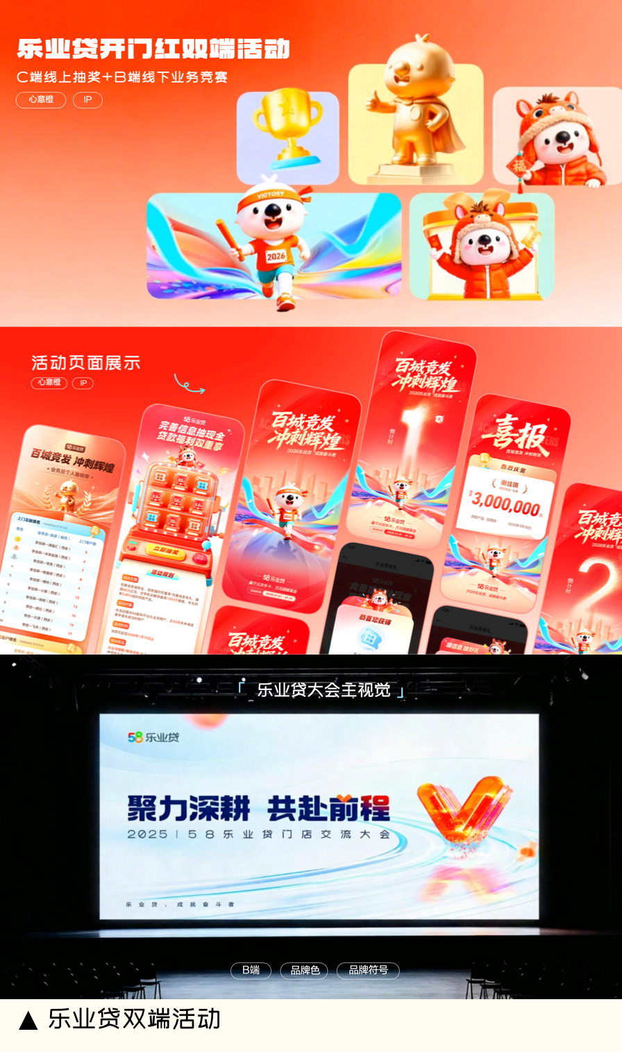 透明科技感V型符号”心意橙”与蓝橙渐变色彩规范,已成为乐业贷品牌识别核心资产,在双端各类场景中具有极高辨识度。