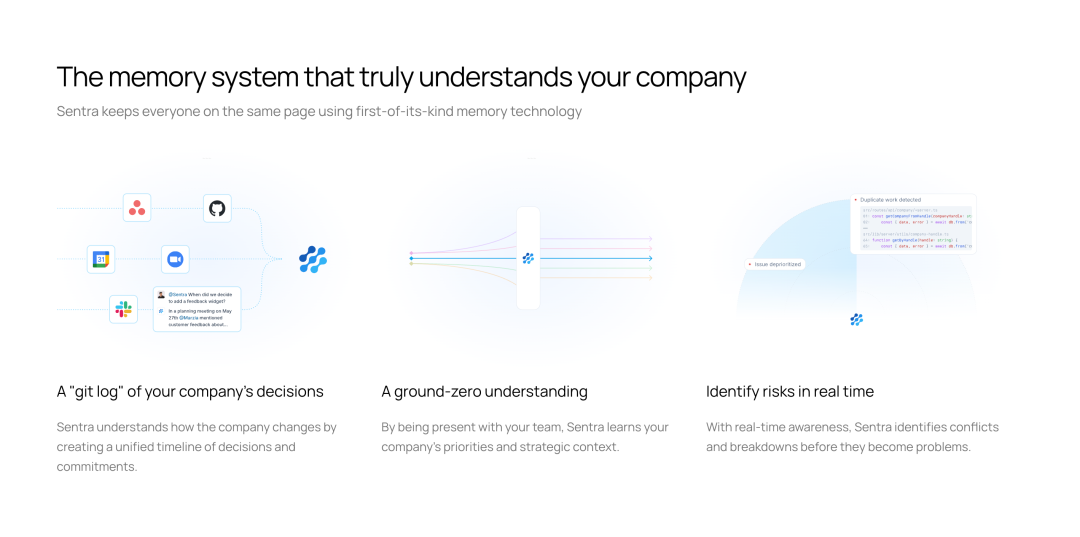 Sentra 的 CTO Andrey Starenky 解释说:”Sentra 充当你业务的大脑,实时真正理解你的团队在做什么。它优化组织思维,使大规模有效领导成为可能,在这种规模下,对齐至关重要,清晰度会复合增长。”这段话揭示了他们的核心洞察:组织需要的不是更好的存储系统,而是一个真正的认知系统。