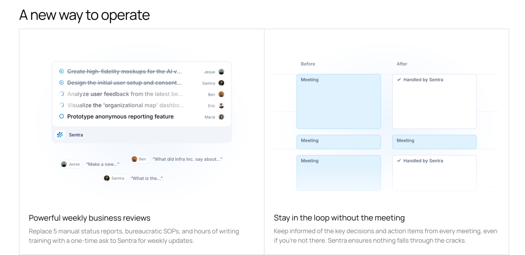 从商业价值角度看,Sentra 解决的是一些非常实际的痛点。新员工入职时间从几周缩短到几天,因为”关于 X 我应该问谁”有了答案。状态更新和决策日志是自动化的,不再需要追着人要。领导者每周得到一个关于团队在哪里偏离、什么需要注意的综合报告。这些都直接转化为成本节省和效率提升。