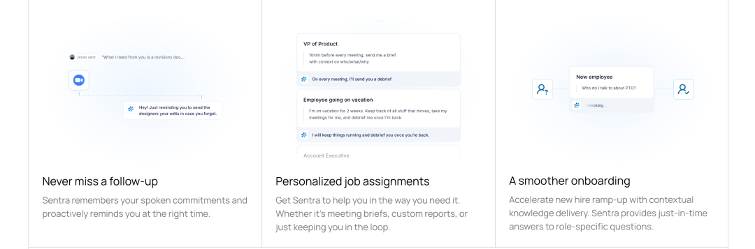 第一个突破是暗物质的数字化。过去,口头决策、走廊谈判、临时头脑风暴会在发生的那一刻就蒸发掉。这些才是真正重要的东西,真正的决策往往发生在非正式的对话中,而不是正式的会议纪要里。但这些对话从来没有被记录下来,它们就像暗物质一样,存在但不可见。现在,随着视频会议、即时通讯工具的普及,这些”暗物质”开始可以被捕获了。Sentra 正是利用这个机会,将这些非正式但关键的对话转化为可理解的组织记忆。