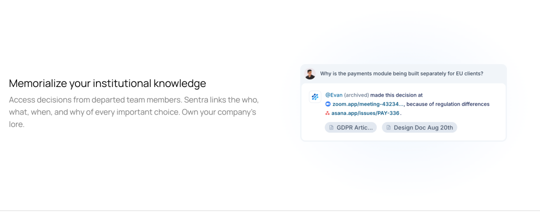 通过 Sentra,这个口头决策被捕获、理解并整合到组织记忆中。下次类似情况出现,相关的先例会自动浮现。这不只是搜索,而是理解上下文、识别相似性、连接相关决策的能力。