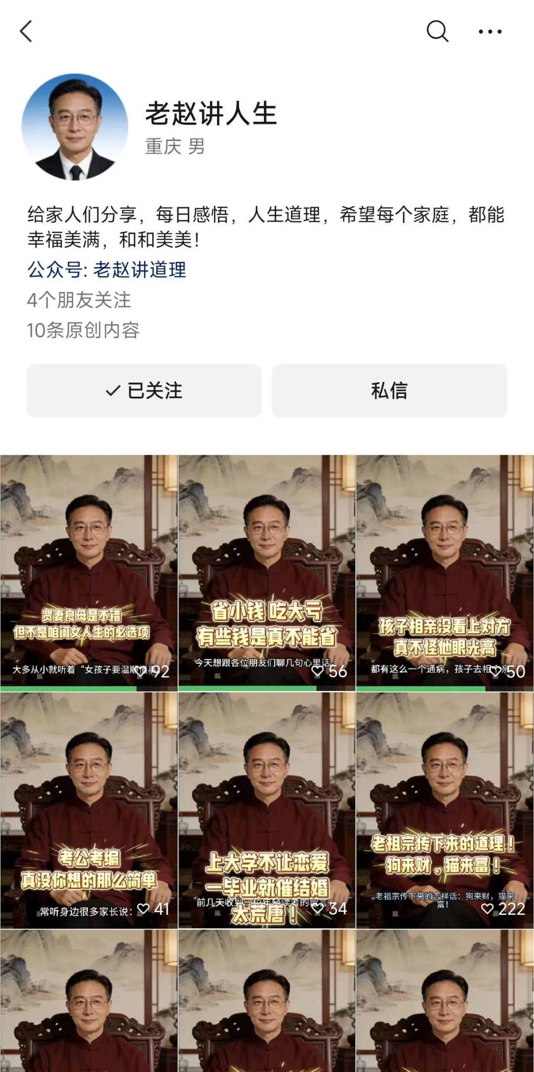 不久前,“是草莓味的猫”还开了新号“郑姐谈家庭”,画风和 “老赵讲道理”如出一辙,主攻育儿、婆媳、中年女性等话题。层出不穷的账号不断壮大着反毒鸡汤赛博专家的队伍。