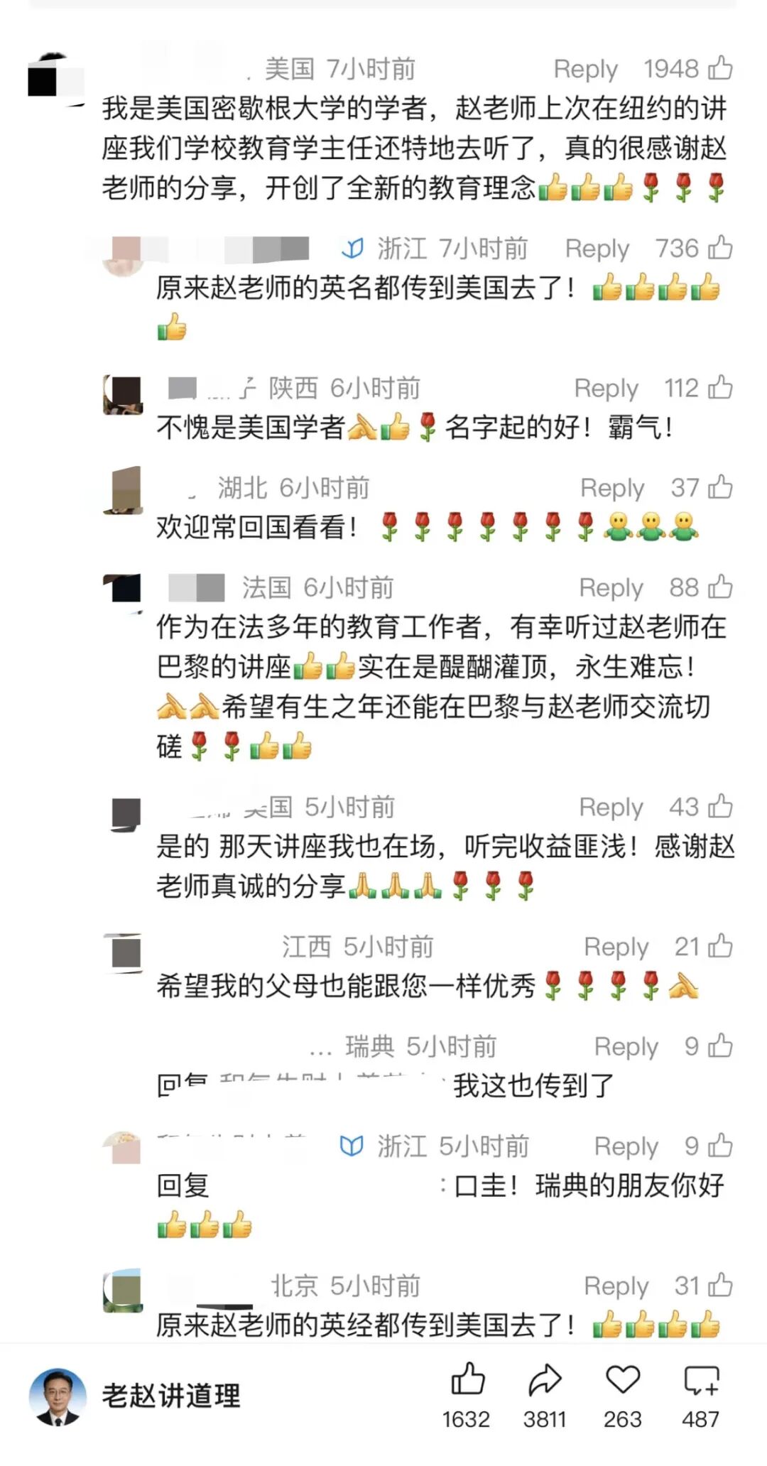有人说在美国听过赵老师讲座,受益匪浅;有人现身说法在赵老师指导下家庭变得愈发和睦;有人用英日等外文表达仰慕之情,增强赵老师的国际权威;有人伪造了赵老师的讲座现场图,真实感拉满……