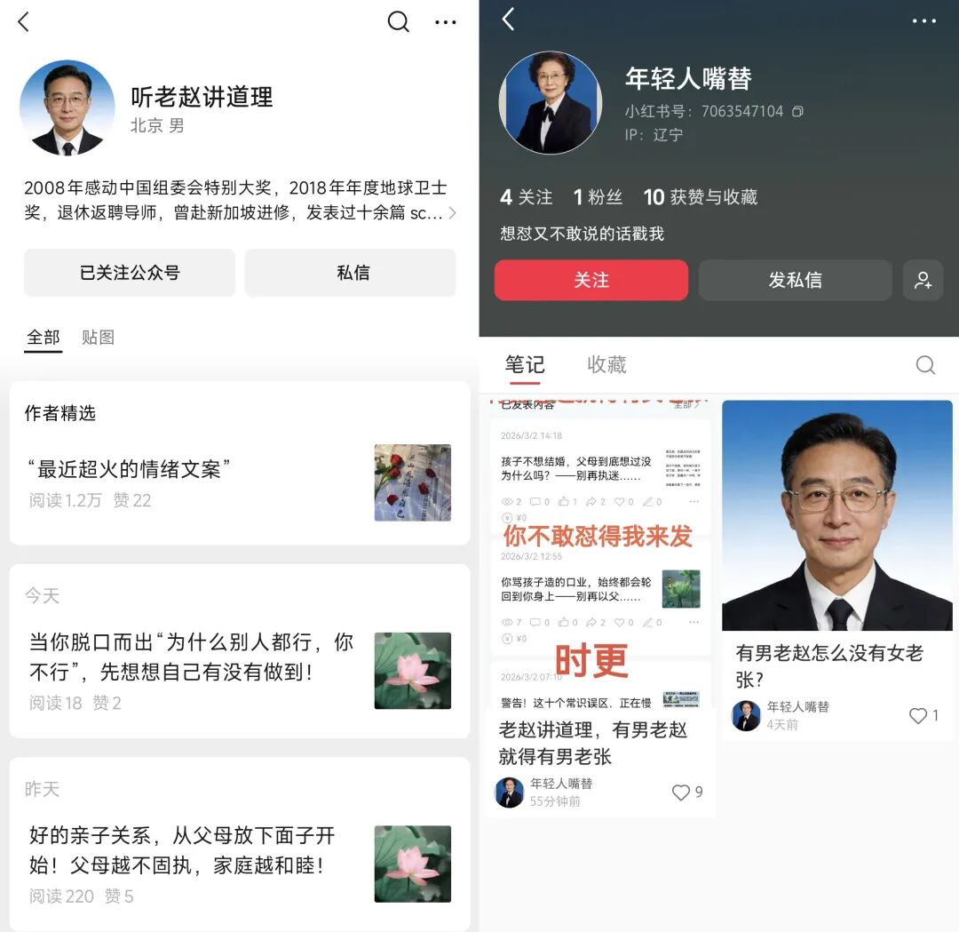 有人化身“老赵讲道理”的好学生,专门开了新号“听老赵讲道理”,继续传播赵老师的亲子研究成果。有人则仿造“老赵讲道理”,用AI编造出各种教育专家。这些专家有的自称清华大学教育科学特约教授、国际认证心理咨询师,有的号称曾帮助10万+家庭化解矛盾、专注中老年心理健康18年。