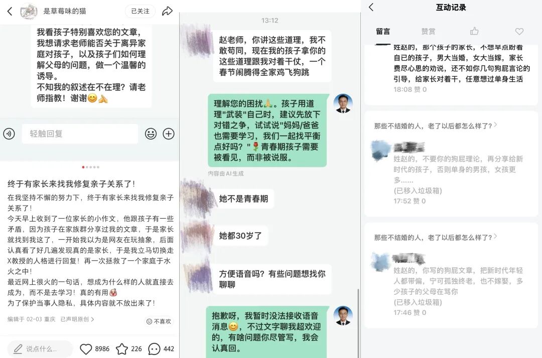 有的父母开始向“老赵讲道理”咨询亲子关系。虽然这其中既有认真请教的虚心父母,也有抱怨孩子自私的固执家长,还有言辞激烈、坚信“男大当婚,女大当嫁”的老派家长,但沟通是一切改变的开始。