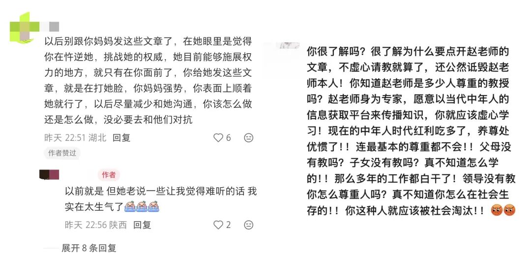 一篇篇借专家之口说给父母听的年轻人人心声,引起了无数年轻人的共鸣。他们中有人在评论区在线反串,不断增加“老赵讲道理”的专家光环;有人将文章转发到“相亲相爱一家人”群,希望父母能从此远离毒鸡汤。