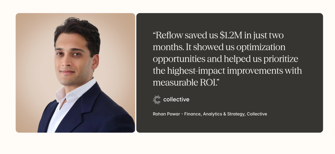 理论说得再好,最终还是要看实际效果。Reflow的早期客户反馈给了我很大信心。Collective的财务、分析和战略负责人Rohan Powar说:”Reflow在短短两个月内为我们节省了120万美元。它向我们展示了优化机会,并帮助我们优先考虑具有可衡量投资回报率的最高影响力改进。”两个月120万美元,这不是小数目。更重要的是,这是可衡量的、真实的节省,不是估算或预测。