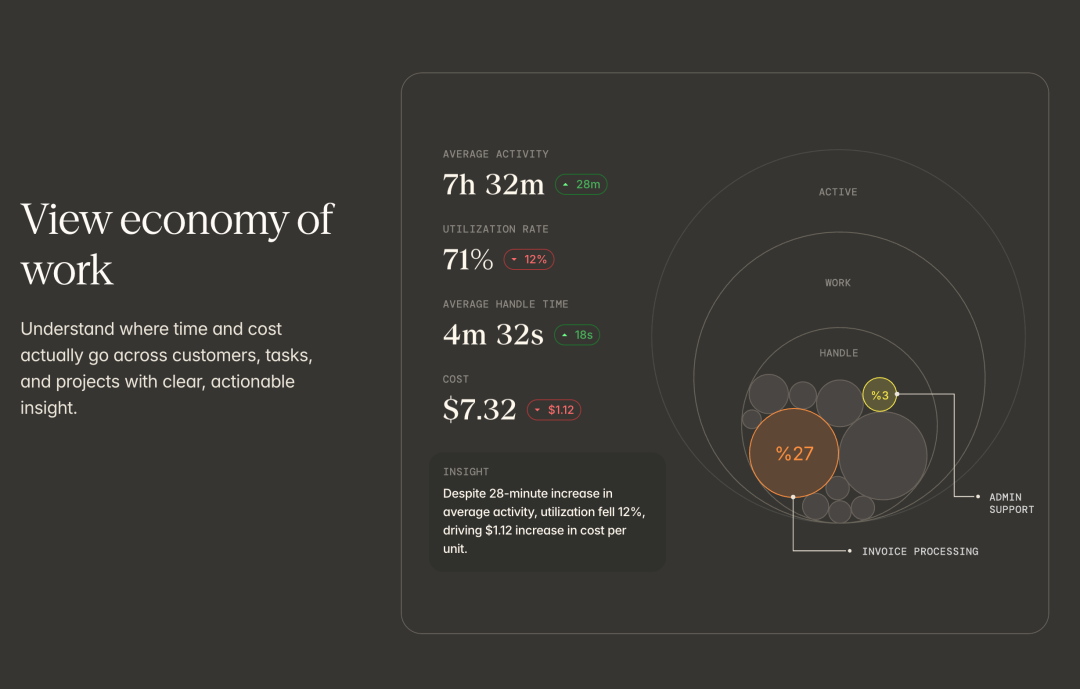 传统的解决方案有几种,但每一种都有明显的局限性。有些公司会进行时间研究,让员工记录自己每项任务花了多长时间。但这种方法根本无法大规模实施,你不可能让150人的团队每天都详细记录时间分配。有些公司使用时间追踪软件,但这类工具往往不准确,因为它们只能追踪在某个应用上花了多长时间,却无法理解工作的实际内容和流程。更糟糕的是,这类工具容易让员工感到被监视,产生抵触情绪。还有些公司选择自建内部工具,投入数百万美元开发,结果发现可见性依然有限,因为很难捕捉到跨系统、跨团队的完整工作流。最后一种选择是聘请咨询公司,花费六到七位数的费用,等待数月才能看到结果,而且往往只是一次性的快照,无法持续追踪。