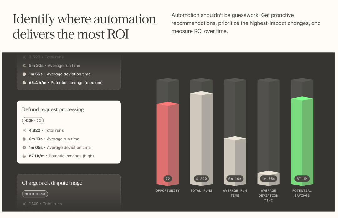 第二件事是决定在哪里应用自动化或AI能产生最大影响。这才是真正的价值所在。很多企业的自动化项目失败,不是因为技术不够好,而是因为选错了自动化对象。他们可能自动化了一个低频发生的流程,或者自动化了一个本身就运转良好的环节,结果投入大量资源却看不到明显效果。而当你有了完整的工作流可见性后,你可以清楚地看到哪些流程重复频繁、耗时长、容易出错,这些才是自动化的最佳候选对象。Reflow甚至会主动推荐自动化机会,帮你确定优先级,告诉你哪些改变能带来最高的投资回报。