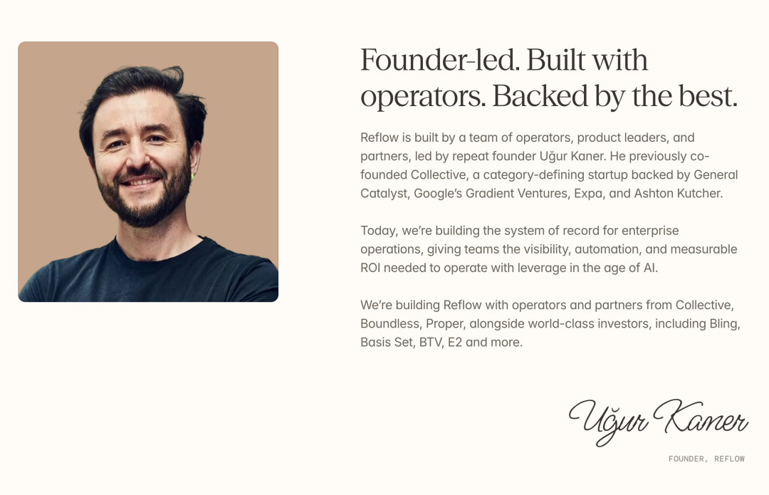 这让我想起最近看到的一个案例。Reflow刚刚宣布完成超过1500万美元的种子轮融资,这家公司正在解决一个被长期忽视但极其关键的问题:让企业运营变得可观测。创始人Uğur Kaner之前联合创立了Collective,那是一家为自由职业者提供服务的公司,融资规模达到数千万美元。在运营Collective的过程中,他发现了一个痛点:公司有150多名运营人员,但他很难搞清楚时间到底花在了哪里,哪些地方运转良好,哪些地方需要改进、优化或自动化。他意识到这不是Collective独有的问题,而是所有运营驱动型企业的共同困境。于是,他创立了Reflow,专门解决这个问题。更有说服力的是,当Reflow在Collective内部实施后,几个月内就带来了超过120万美元的可衡量投资回报。这个数字不是预估,而是实实在在节省下来的成本。