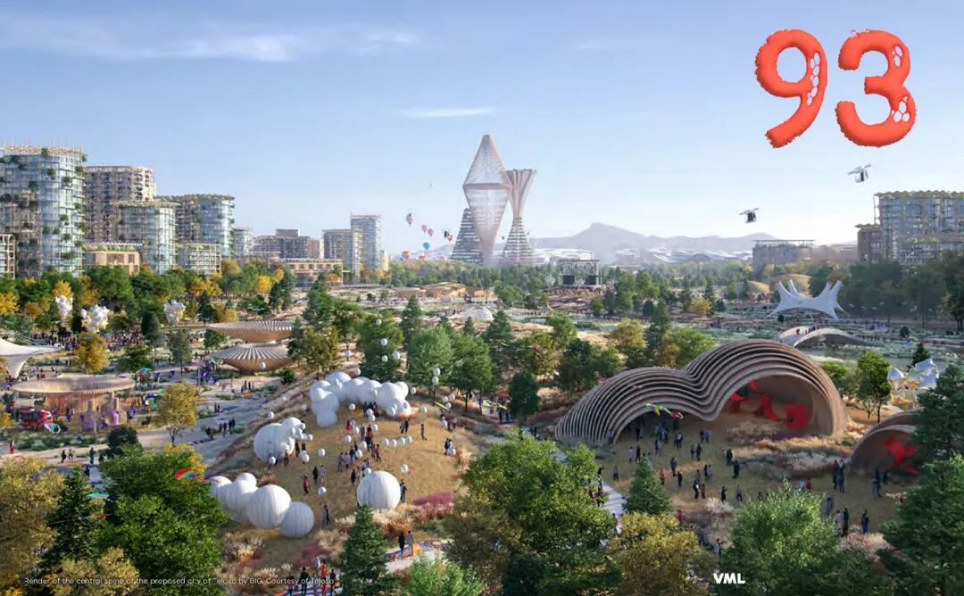 在美国,亿万富翁马斯克的Telosa项目正在塑造一种截然不同的叙事。这个由Bjarke Ingels Group (BIG) 构思、预计于2050年建成的”从零开始的城市”,其核心是公平的土地所有权、自动驾驶交通、木制巨型建筑以及15分钟城市理念。效果图展示了交通枢纽、体育村和垂直区域,旨在塑造BIG所描述的”技术乐观主义的未来”,即创新与公民公平共同发展。