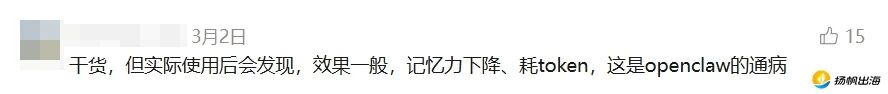更有网友指出:实际使用后会发现,效果一般,记忆力下降、耗token,这是OpenClaw的通病。