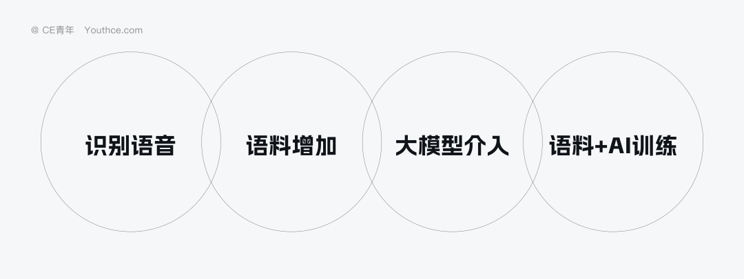 首先是基础的语音识别,将声音转为文字,这个阶段识别率不高。随后用户规模变大,语料增加,开始变得好用一点,但依旧不够。