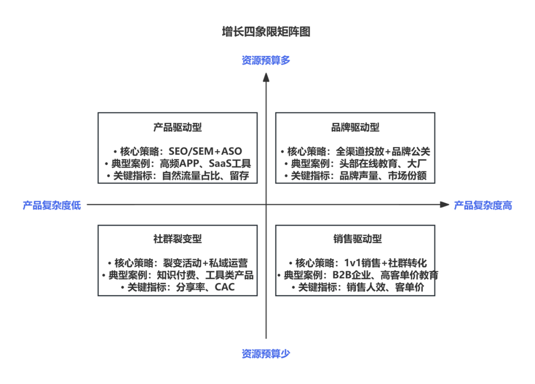 - 找到你的象限,聚焦1-2个核心增长引擎,不要贪多