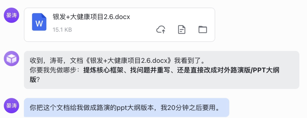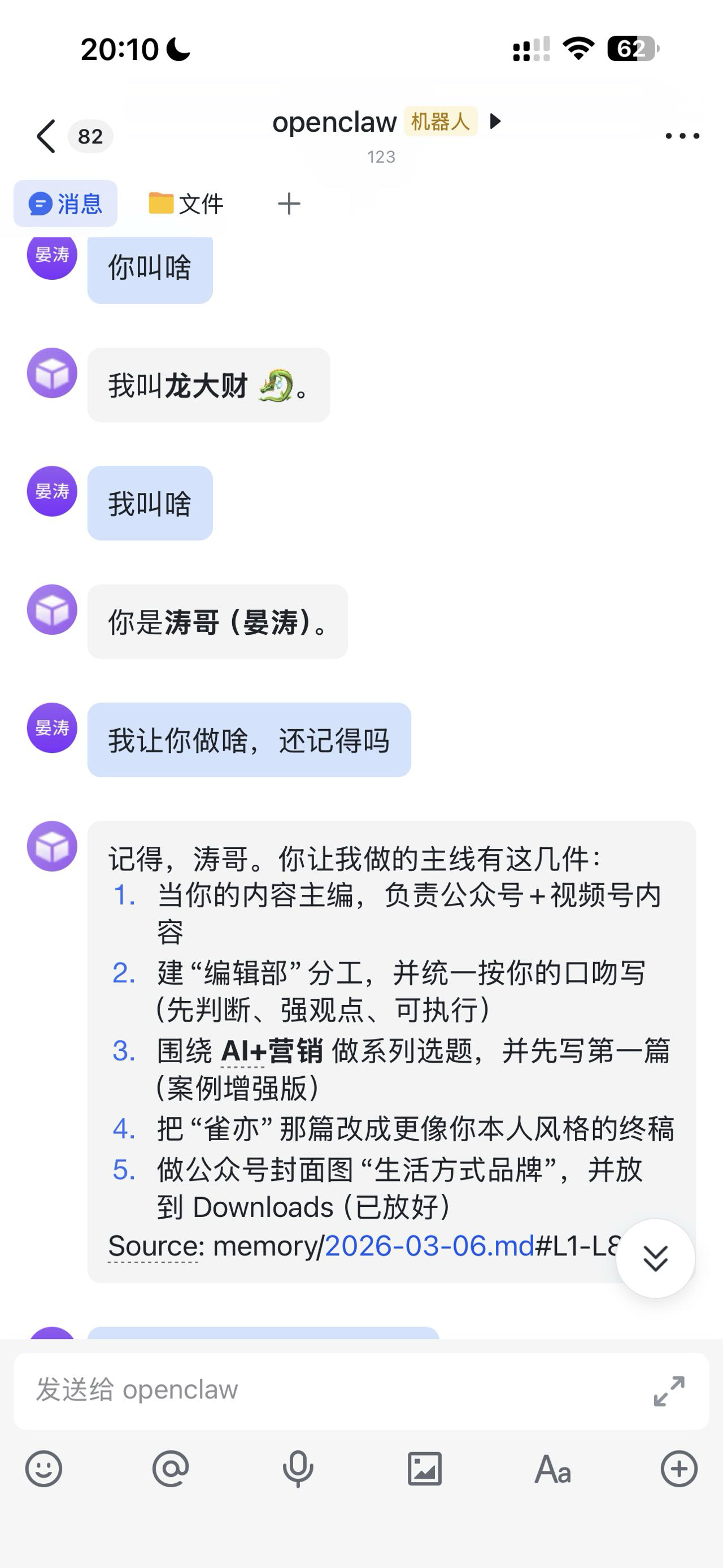 我直接扔给它一份文档,没说任何话。大财(龙虾)很主动问我,先做什么?要做什么?