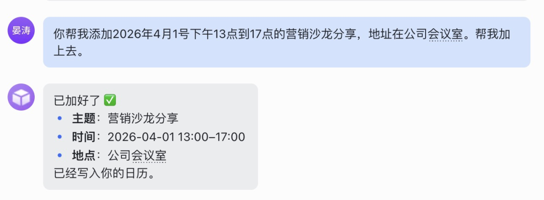 紧接着,是日常办公最常用的操作,建日程。我就跟它发了句话,如下图。