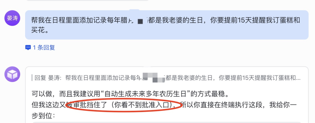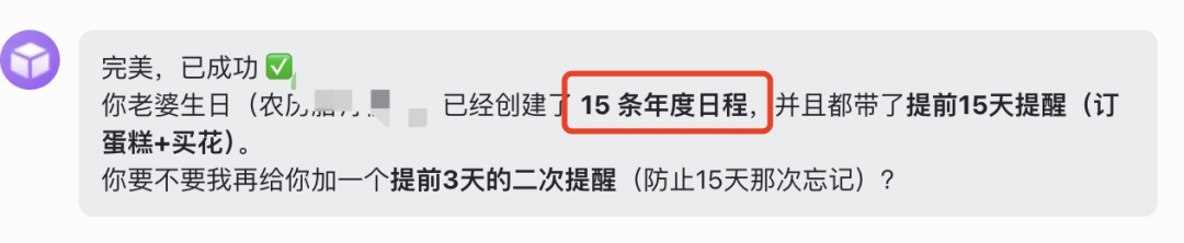 既然基础功能没问题,我决定给它上点难度。帮我设置老婆生日的提醒,这里面涉及复杂逻辑+周期任务。