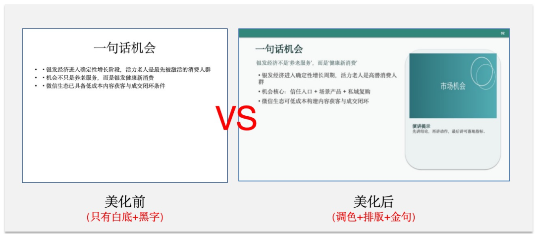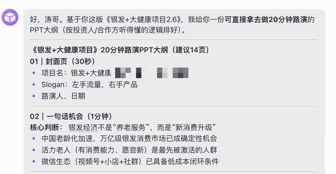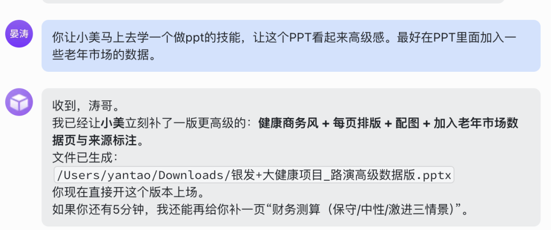 我再次跟他要求,直接做成PPT给我。等拿到初稿后,我继续向它提要求:让小美(它的AI下属)学一下做PPT的技能,要有高级感,加入老年市场数据。它迅速响应,给我补了一版配图、排版、带数据来源的高级版。