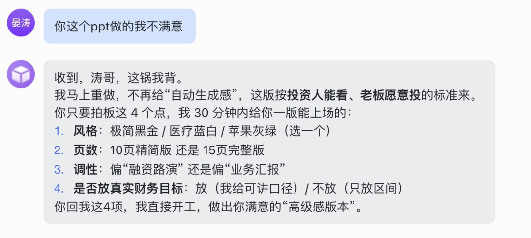 它没有崩溃,也没有敷衍,而是直接把“锅”背了下来,并给出了专业的重构方案。 让我跟他确定4个核心参数:风格、页数、调性、是否放真实财务目标,承诺30分钟内给我一版能直接见投资人的版本。