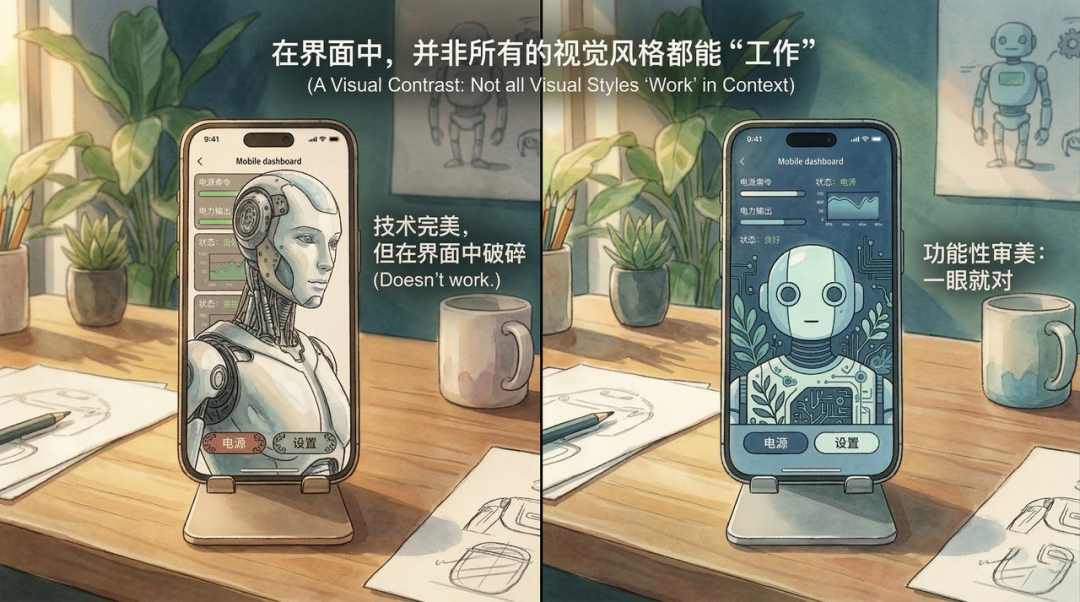 什么叫”在界面里工作”?举几个具体的例子。一张图的光线太硬,放在卡片组件里会抢焦点,用户的视线会被图像吸走,看不到旁边的文案——这张图不工作。一张图的色温偏暖,但整个 App 的视觉语言是冷调的,放进去之后整个界面的气质会断裂——这张图不工作。一张图的构图重心在右侧,但文案是左对齐的,两者在视觉上会互相打架,用户会感到一种说不清楚的别扭——这张图不工作。